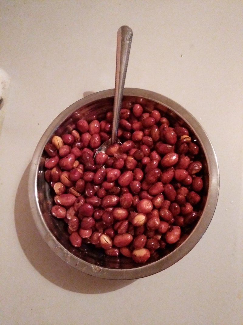 3:热锅冷油把花生米倒进锅里,用小火不停的翻炒,炒到变色尝下外面有点脆把火关掉翻几下用盖子盖上,过一会把盖子打开放点椒盐和一点点盐,看个人的口味放,装到盘子里就行了。