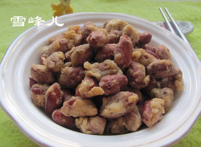 4:搅拌均匀,使每颗花生米都沾到面粉。