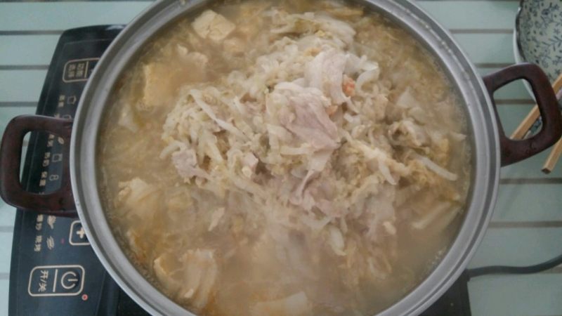 5:蘸酱做好后,将盐、味精、蚝油放入,煮至酸菜熟(胃不好的朋友可以等至软烂)后加入煮好的五花肉,上桌,分盛至电磁炉。