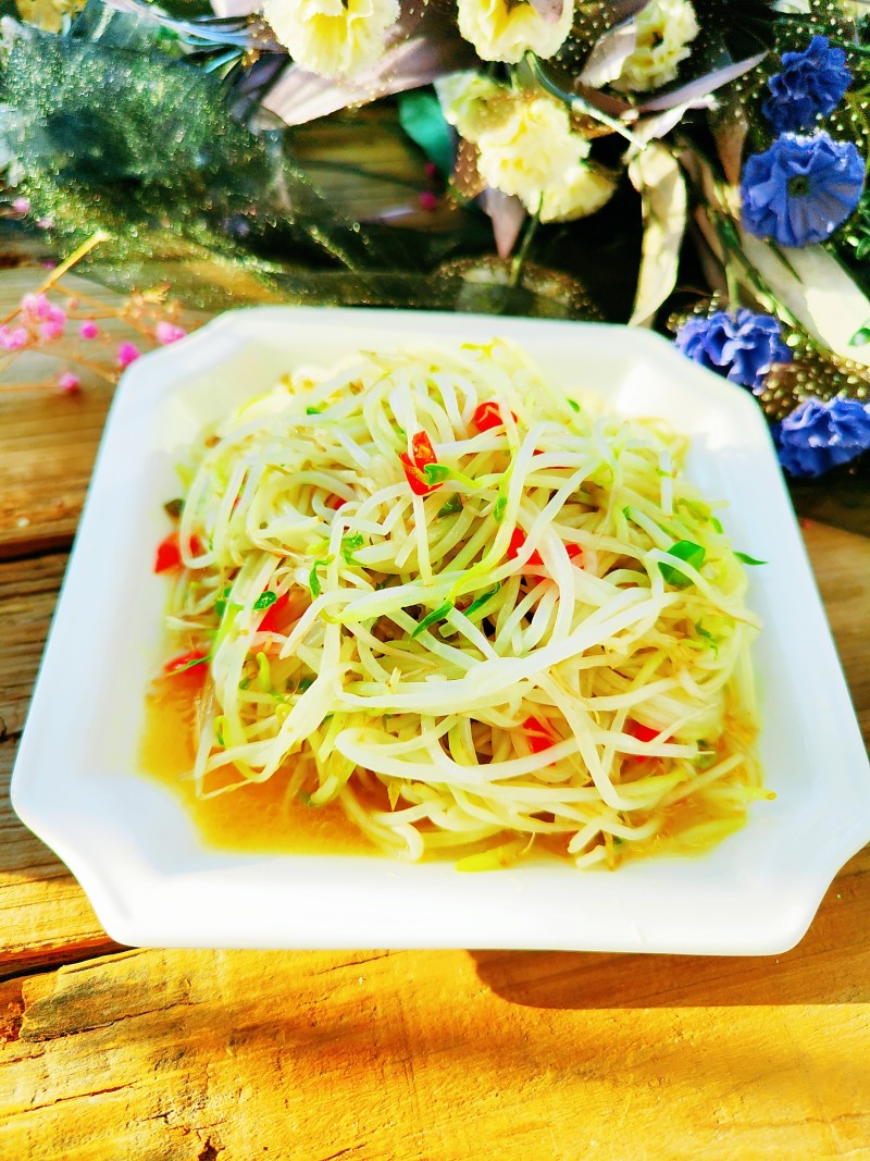 6:下入绿豆芽,加入适量盐,白醋,味精,少许糖,胡椒粉
