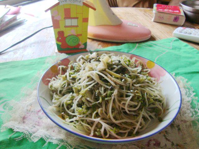 1:绿豆芽洗净切成小段,焯水洗净备用,目的是去掉豆腥味。