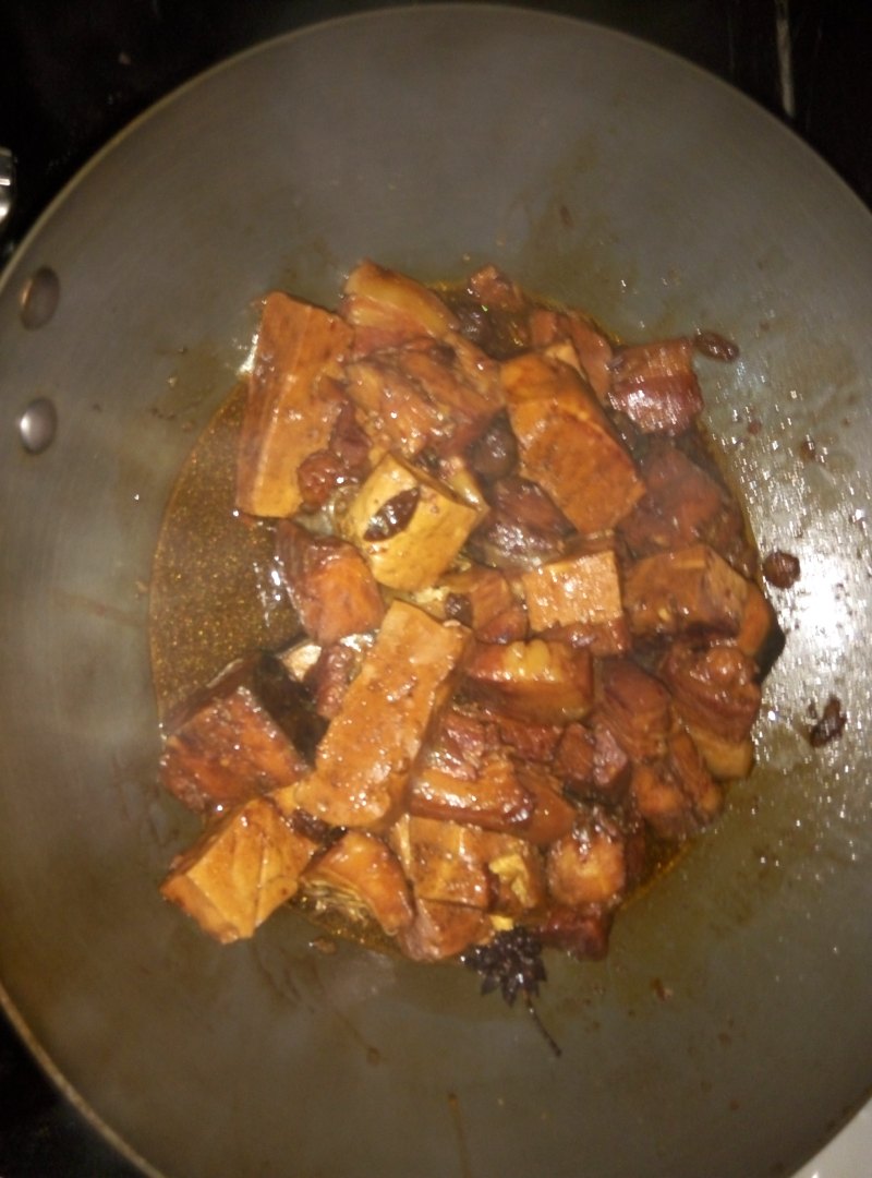 2:五花肉,咸鱼和豆腐分别焯水,之后锅烧热放少量花生油,加入姜片炒出香味,放入两勺糖,待糖融化后放入五花肉,翻炒至五花肉开始冒油,加适当老抽,生抽和料酒,加水至水面没过肉,放入几颗八角,大火煮开,之后转小火煮一个小时,吃时放入咸鱼和老豆腐,继续煮半小时。