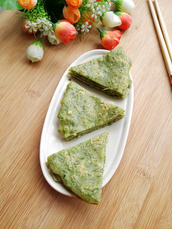 液体的添加量,要根据自家面粉的吸水量来调节,我给的是个参考量。最后和成的面糊是流动的状态,这样烙出来的饼会比较软。茴香要切得小一些,这样口感会更好。我用了170克的薄荷汁。