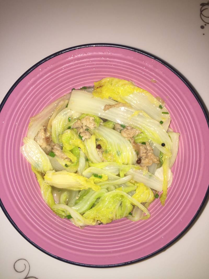 8:等白菜炒熟后加入小半勺味精,翻炒入味即可。