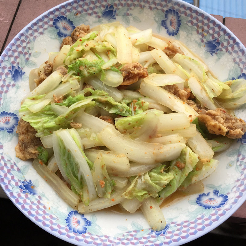 油渣炒青菜,一道朴素却勾魂的家常美味。热锅下猪油渣,小火逼出最后一缕荤香,油脂浸润铁锅。猛火倒入青菜,“刺啦”一声响,锅气升腾。快速翻炒间,青菜染上油润光泽,边缘微焦,脆嫩中吸饱了猪油特有的醇厚。只需一撮盐点化,咸香便托出青菜的清甜与油渣的酥脆,那是灶火间最踏实的幸福滋味。