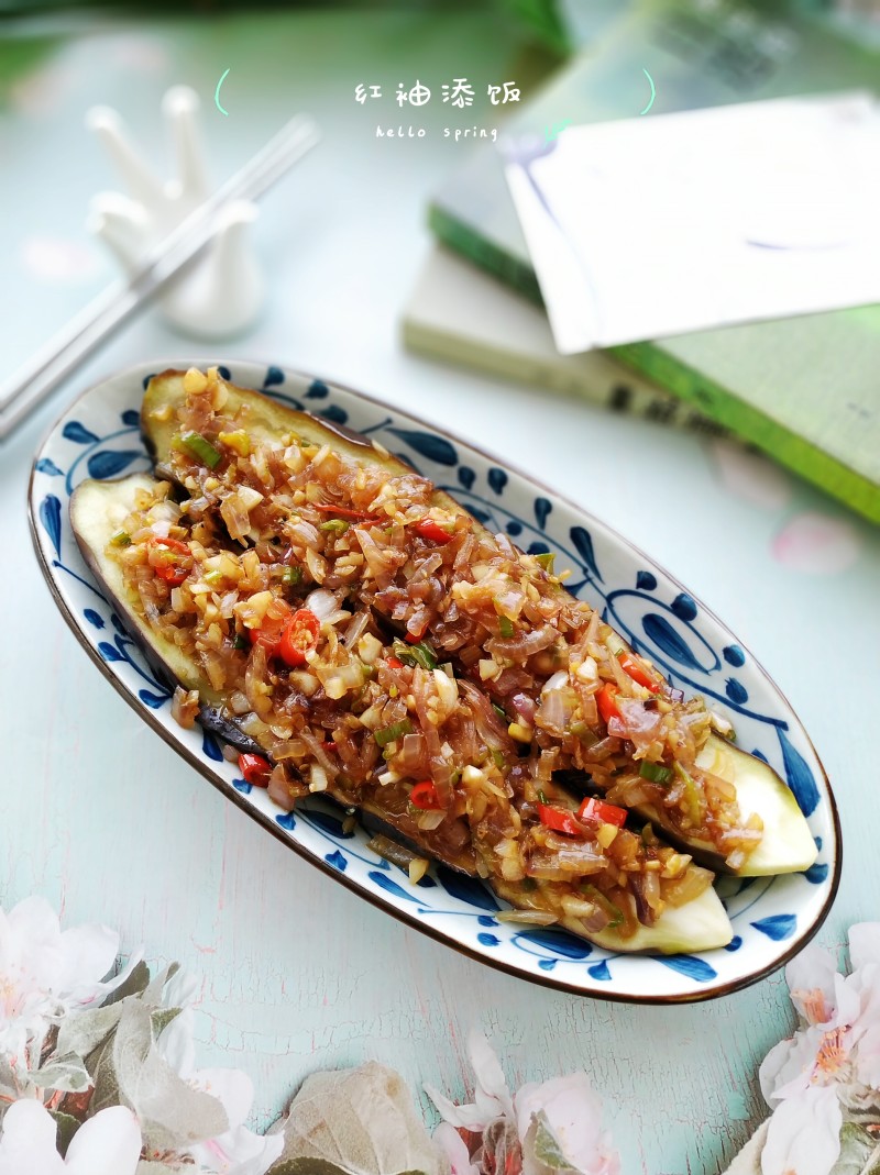11:将煸炒好的佐料放在茄子上。