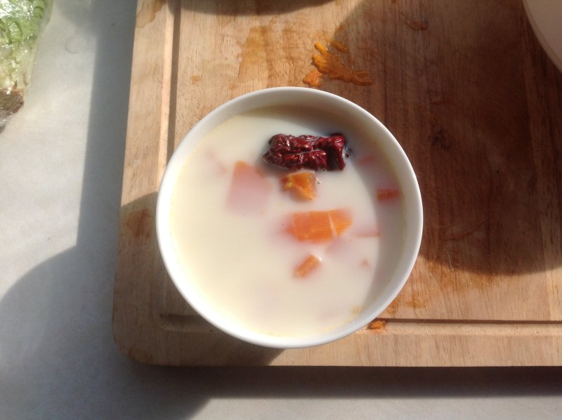 3:100ml矿泉水、100克木瓜汁、100克木瓜块、10克冰糖、3克红枣片放入牛奶锅中;