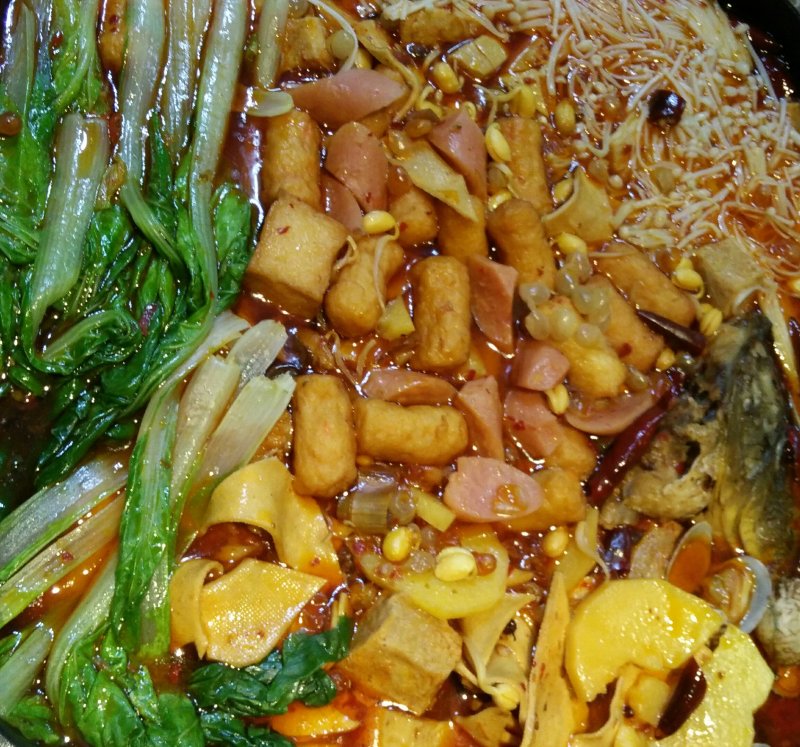 2:热锅下油,放入火锅底料和一勺豆瓣酱,然后放入大蒜片姜片葱段炒香加水,等水开了放入配菜,