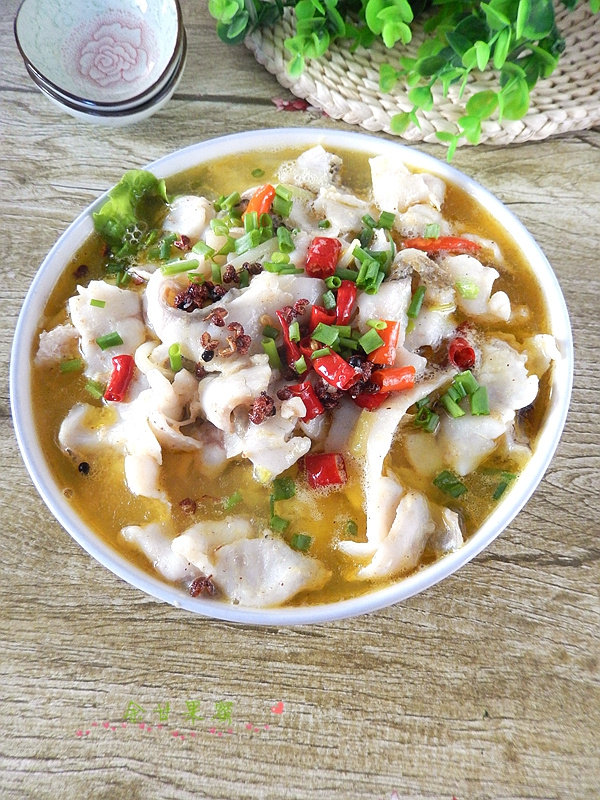 14:倒在鱼片上。美味的水煮鱼上桌喽。