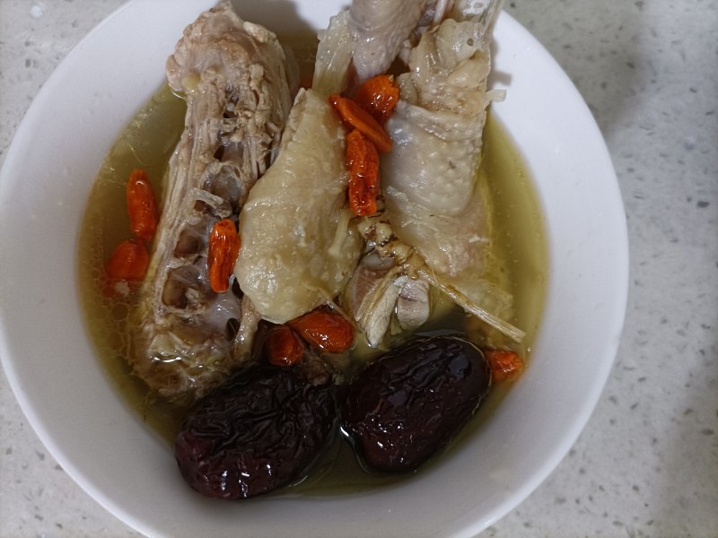 2:转入砂锅,加入红枣,人参,适量水大火烧开转小火煮至鸡肉熟透。