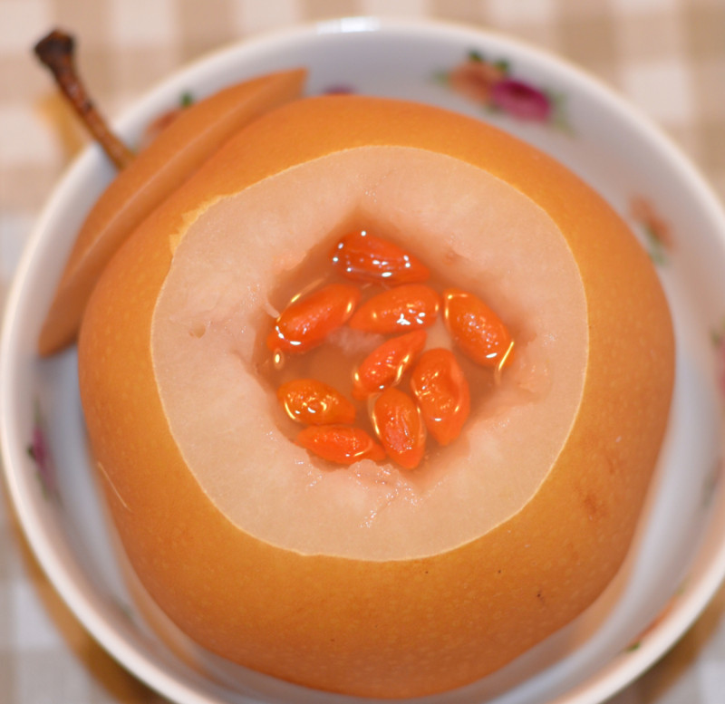雪梨1个(280克);西洋参5克;枸杞适量;