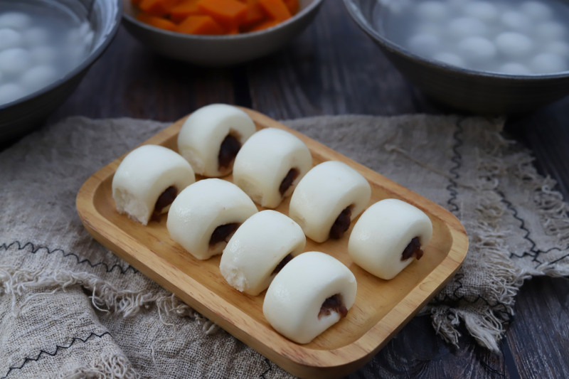 11:按同样的方法,包完剩余的9份面团,而4份小面团没有模具,就直接做成豆沙圆形馒头