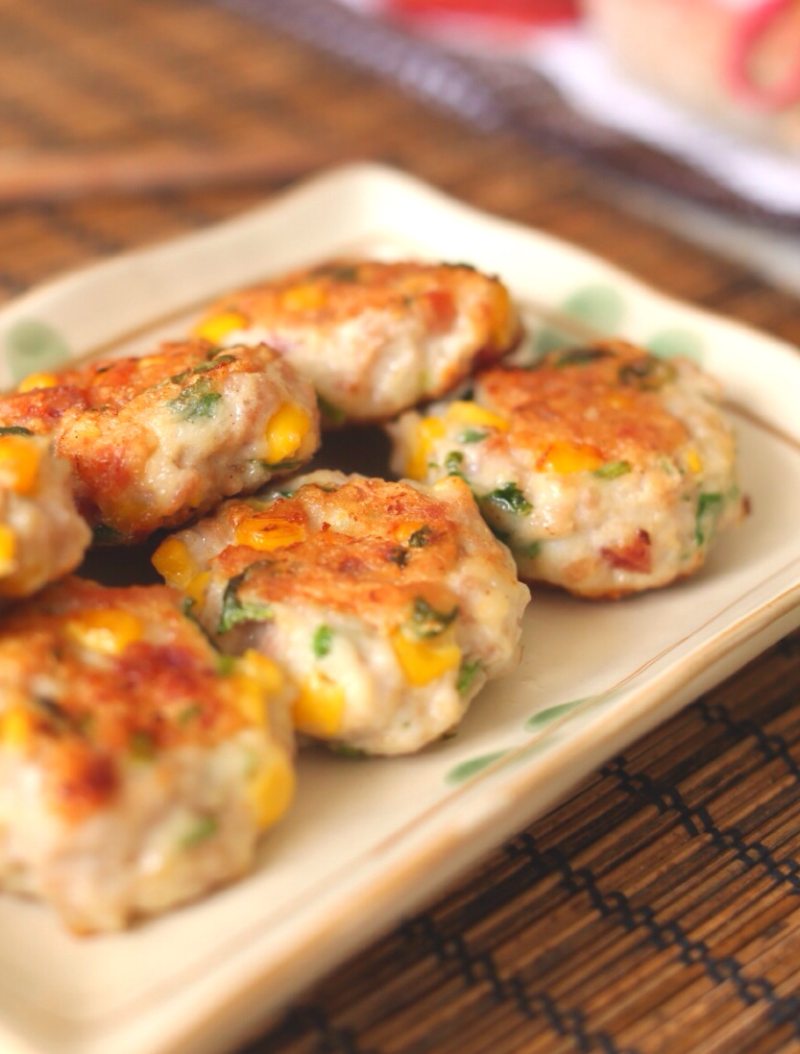 猪肉碎适量;鱼茸适量;蛋清1个;培根适量;玉米粒适量;