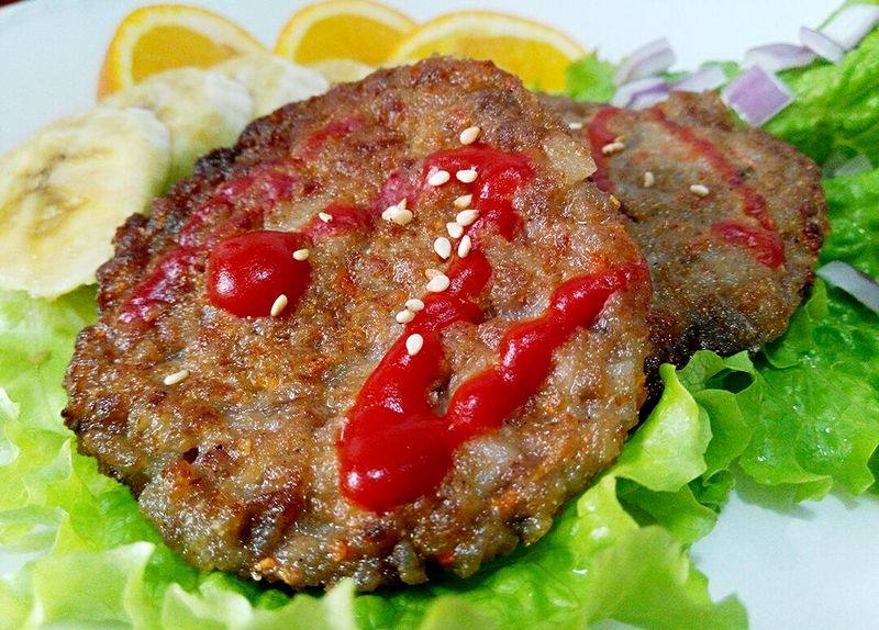 肉饼不宜太厚,且小火慢煎,切忌旺火,以免外焦里不熟。