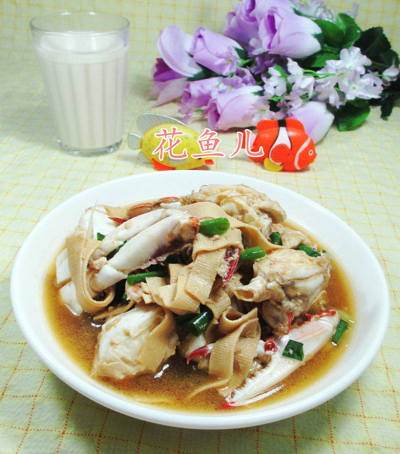 1:食材:螃蟹(已清洗)、千张(已切开)、香葱