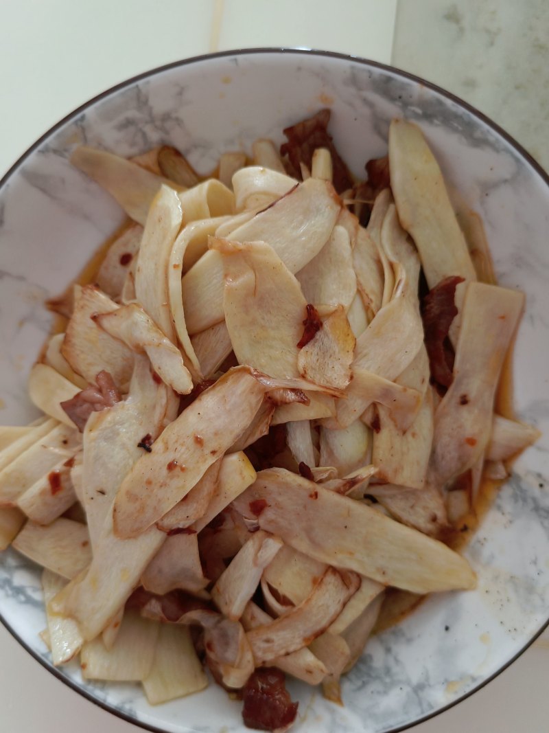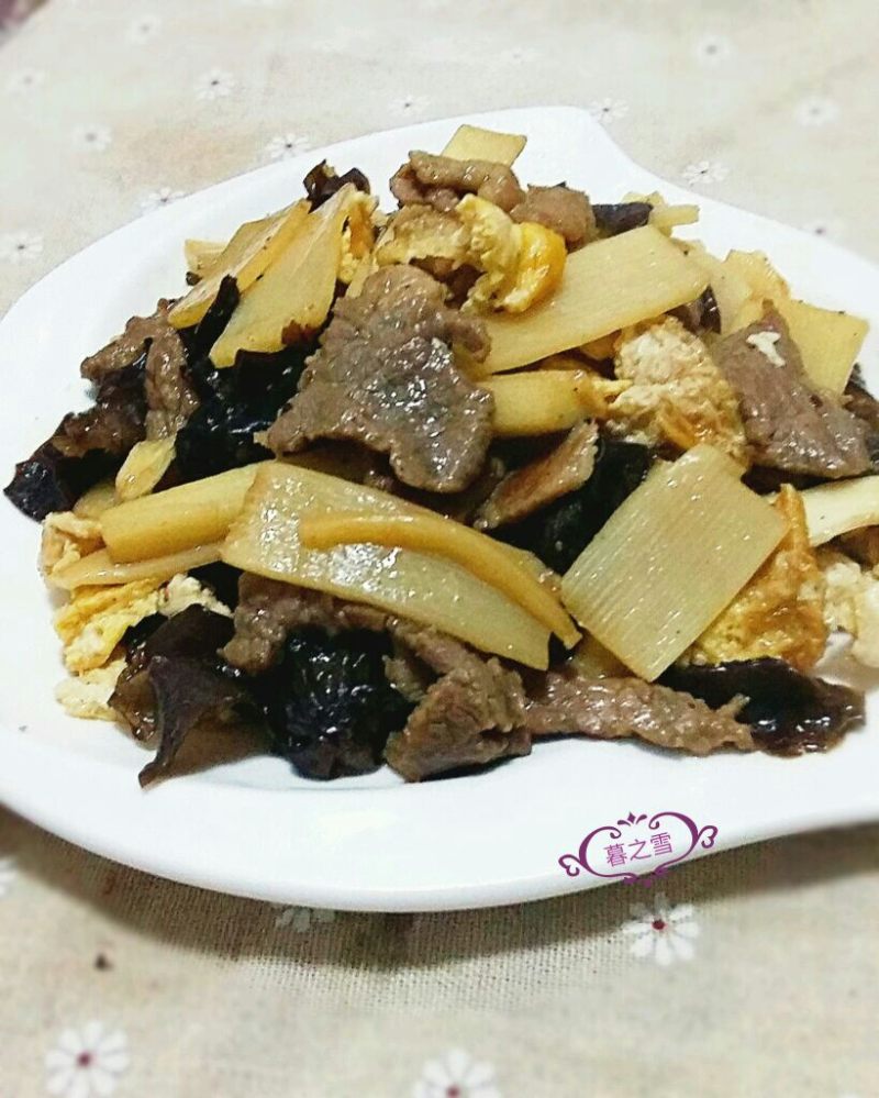 1:准备好材料,笋子用盐水煮一下去涩味,木耳泡发,肉片提前加点料酒生抽腌制一会