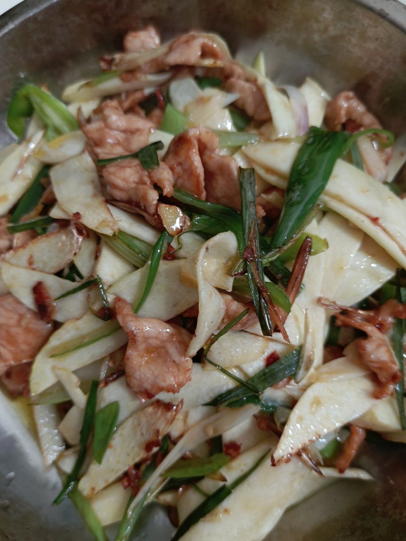 1:瘦肉洗净切片用少许料酒酱油地瓜粉拌匀,笋洗净切片,姜蒜切片