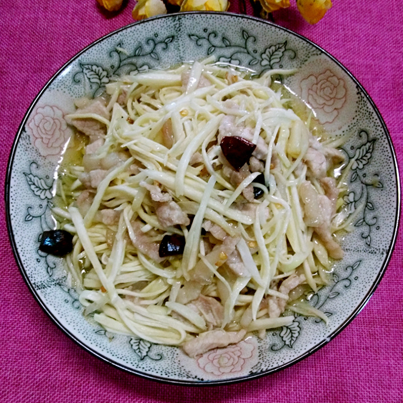 瘦肉100g;笋100g;姜几片;蒜2瓣;