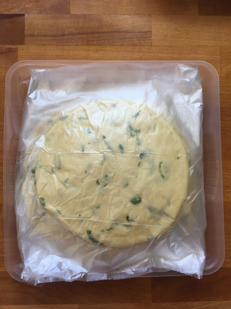 15:15.将整理好的葱花饼放入盒内,再放入冰箱,吃的时候随时取出。
