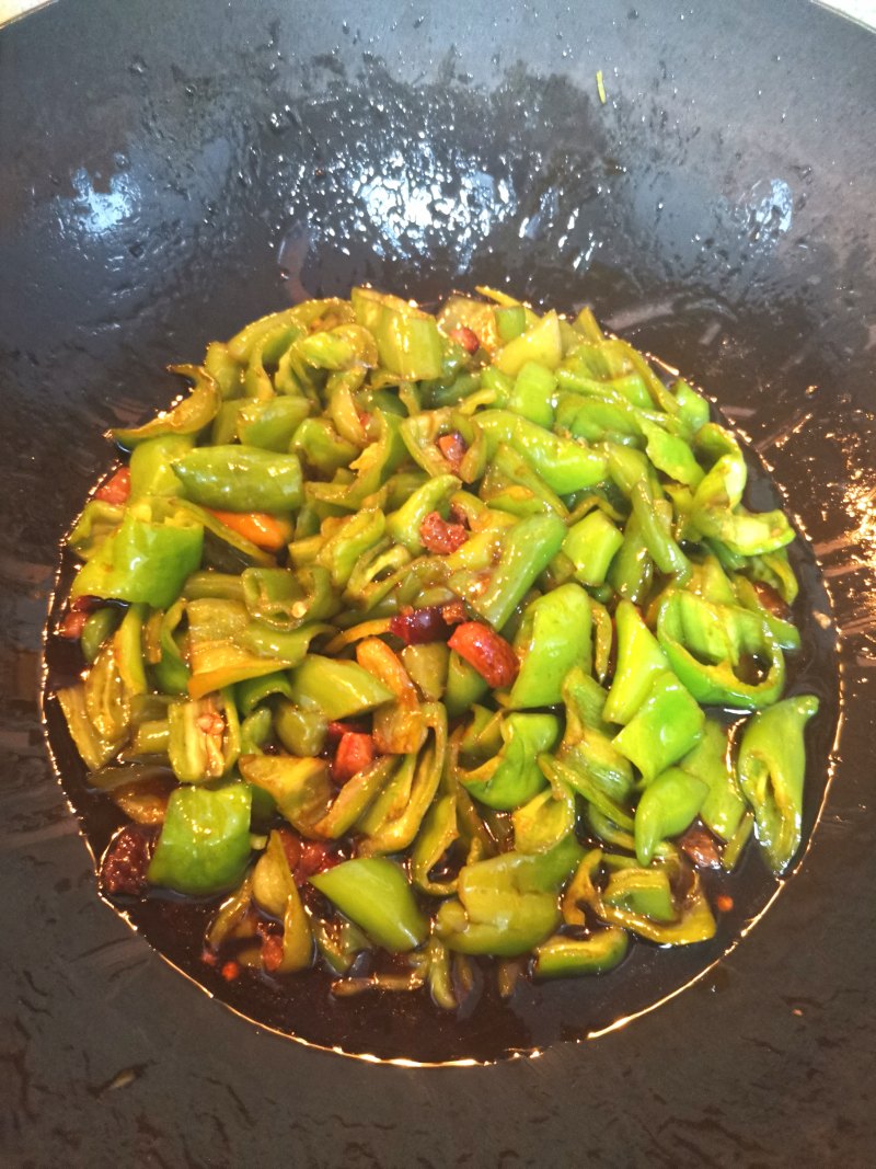 5:再放进尖椒丝,放点盐让辣椒入味。