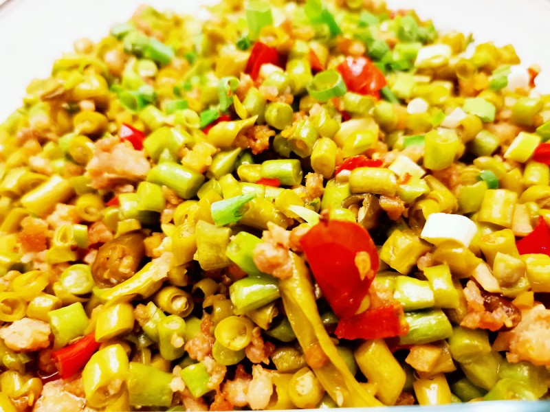 4:豇豆酱肉切丁,豇豆可以提前一天腌,加入一般新鲜的豇豆,不用加盐,加少量的鸡精和香油。