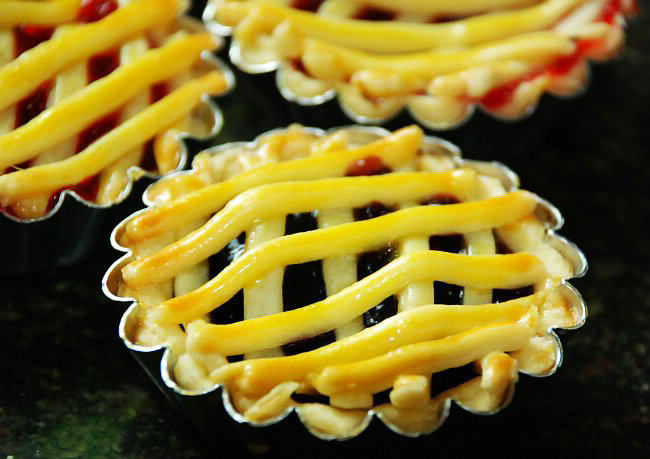 1:懒的同学可以直接买蛋挞皮跟蛋挞水哟。再往上面铺蓝霉酱,用剩余的面条成网状铺到酱上。