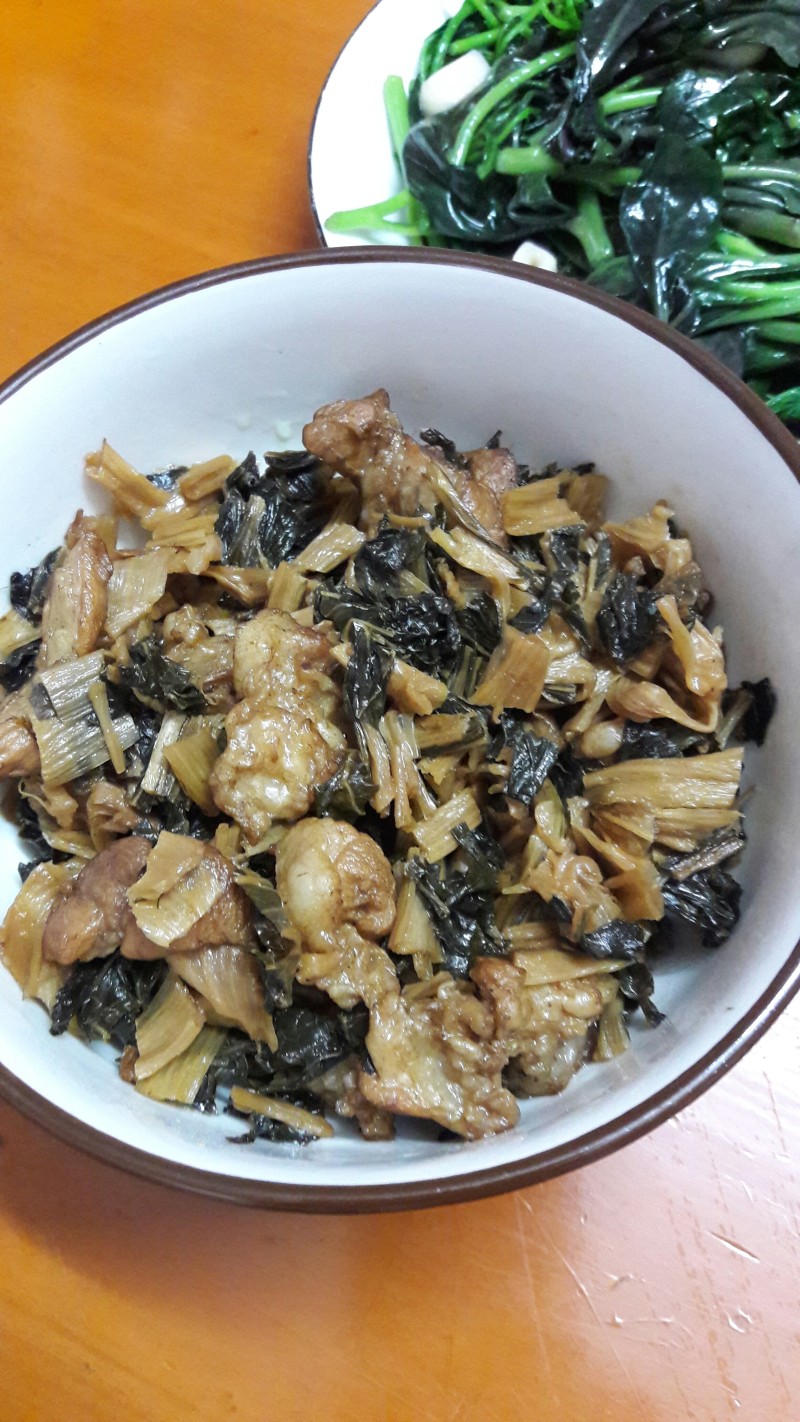 1:菜干提前半天冷水浸泡。泡开叶子后清洗干净,小心清洗叶根和叶片,要不然有泥沙藏里面,特别是买的,更要注意洗干净。