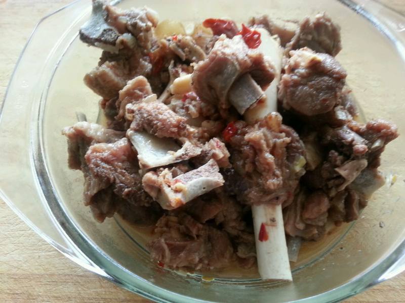 1:新鲜带骨羊肉剁成一寸大小的块放入锅中