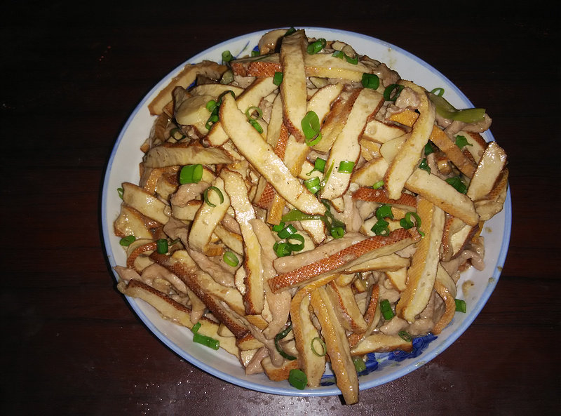 猪通脊肉300g;豆干300g;葱适量;姜适量;蒜适量;鸡蛋1个;