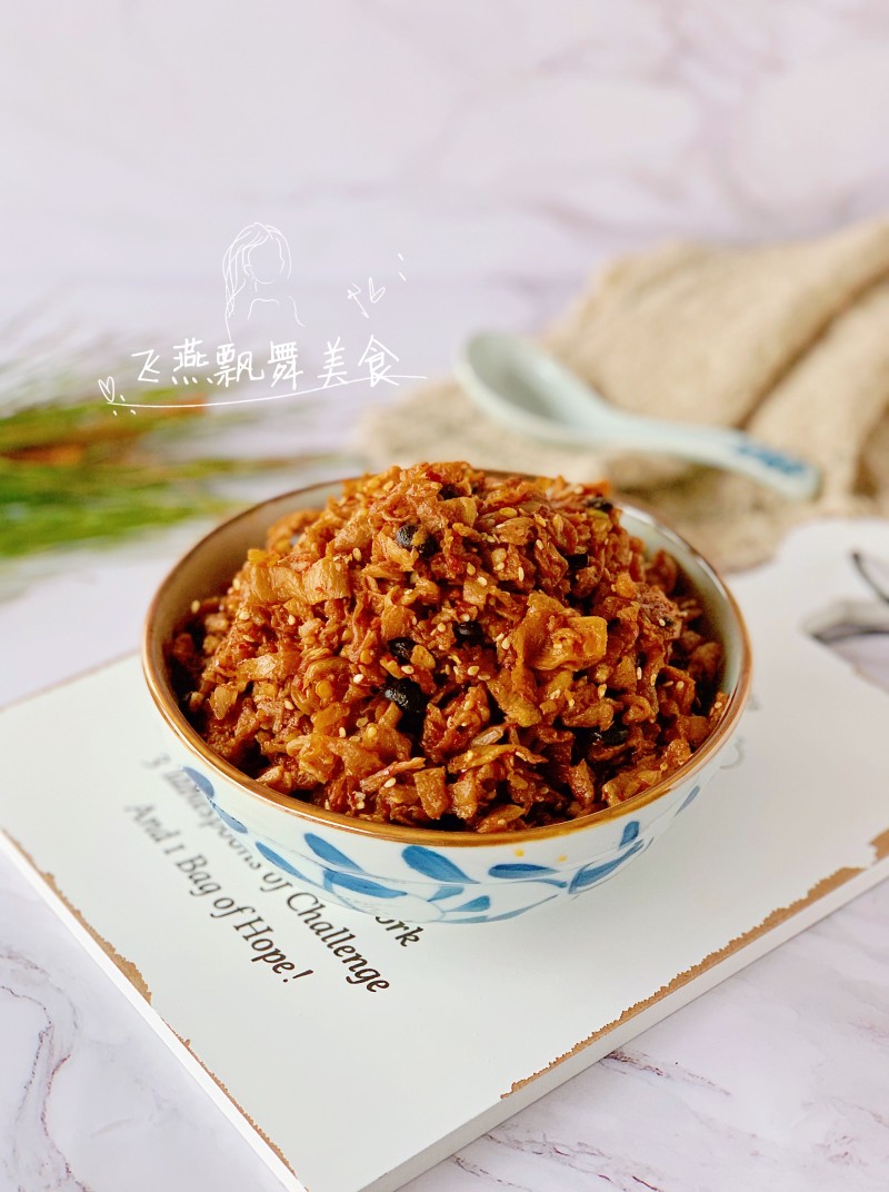 9:所有调味料放入后再次翻炒3分钟左右,萝卜干没有水汽后关火,放入芝麻炒匀,凉透后装入消毒的玻璃瓶中,放冰箱冷藏,一个星期内吃完最佳。