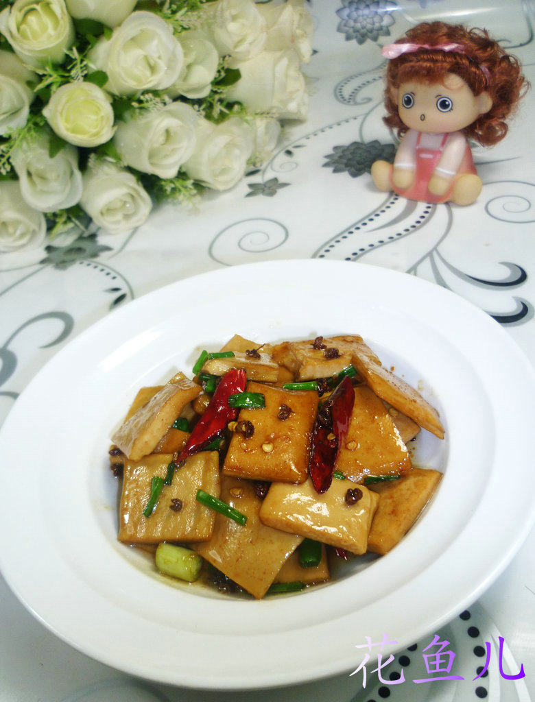7:放入豆干,加适量的盐翻炒。