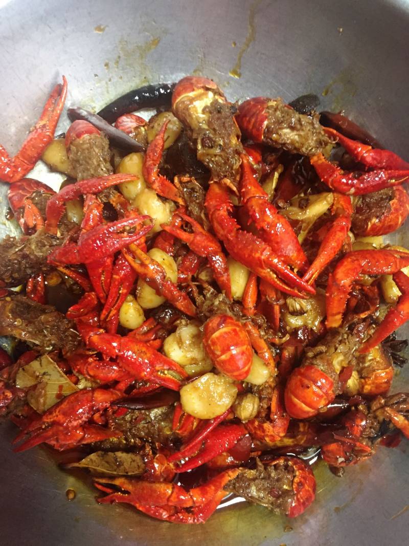 5:锅里小龙虾中间挖一个小洞,放入豆瓣酱,翻炒