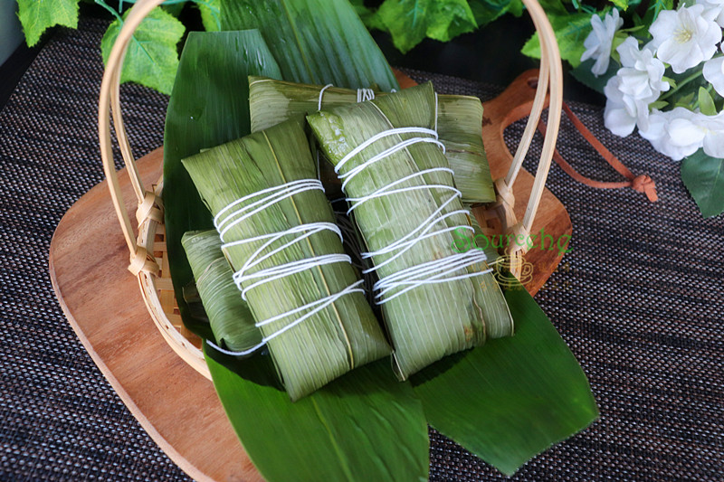 6:包裹好的蕉叶糍就是这个样子,可以用剪刀把多余的叶子、绳子剪掉。放入篮子,可以沥干水。