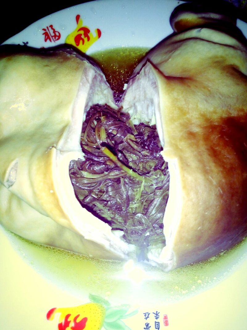 6:再把小葱和姜片塞进猪肚里面