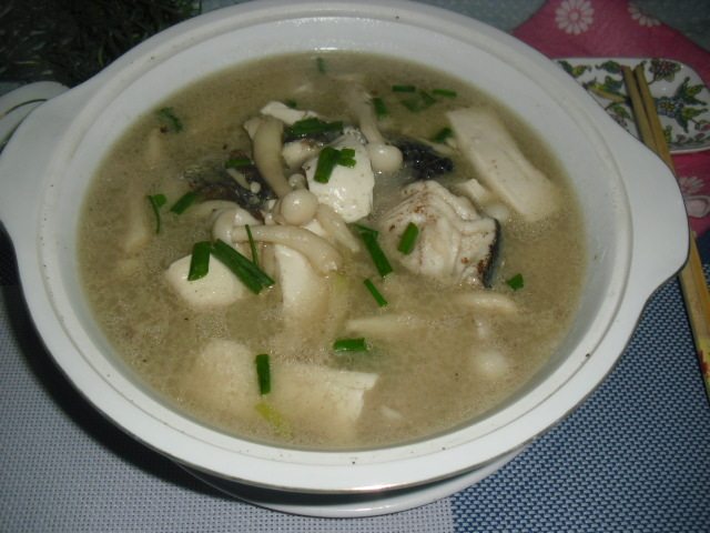 6:煮至鱼汤发白,放入豆腐玉菇少许盐煮5分钟.