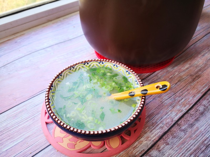 6:喝的时候准备好葱花、香菜、盐和胡椒粉,放到汤里味道很鲜,很营养。