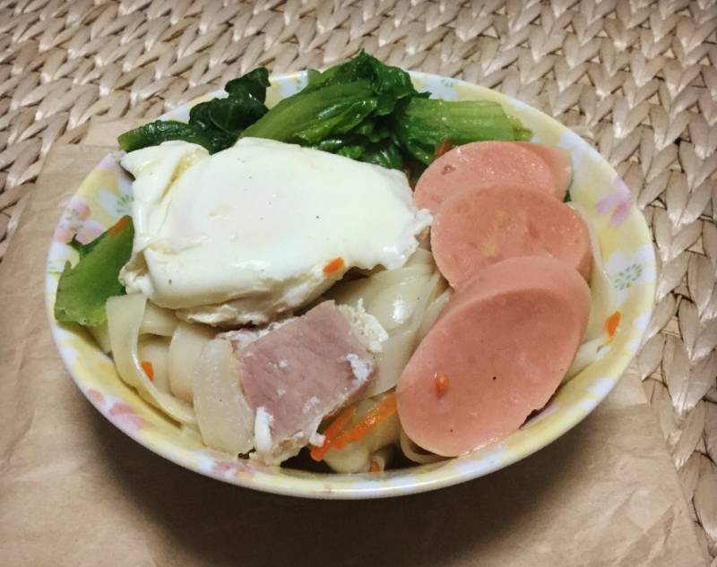 2:待咸肉片变色,倒入事先烧好的开水,水再开后打入鸡蛋,加盐、黑胡椒和少许酱油,放挂面。