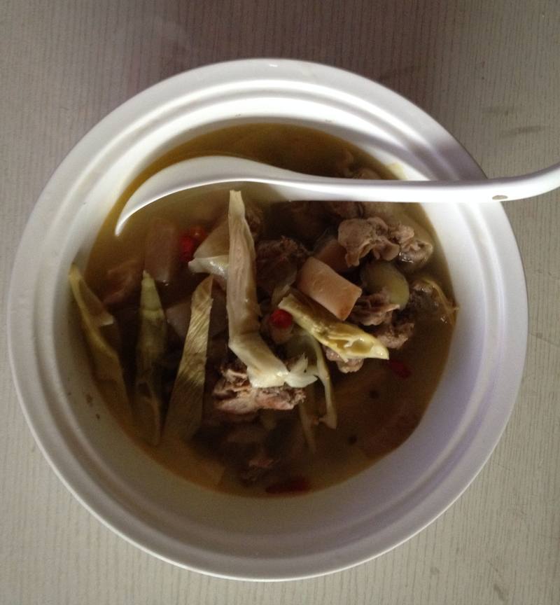1:准备材料。这次没买到整鸭,用的是鸭腿,三支鸭腿剁块。笋提前一天泡发,酸萝卜切块。