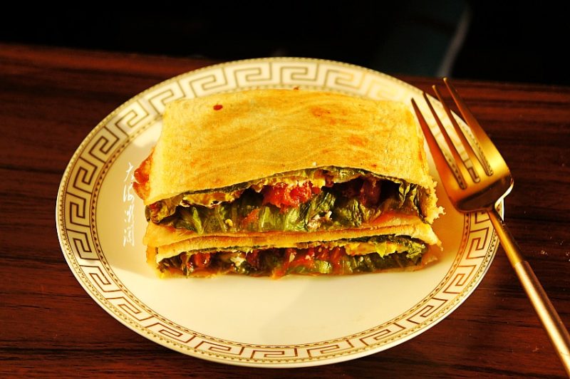 7:将生菜叶的边边收回来,再码入一片吐司片,然后送入三明治机,启动电源,根据自己喜欢的口感,时间设置3~5分钟即可。