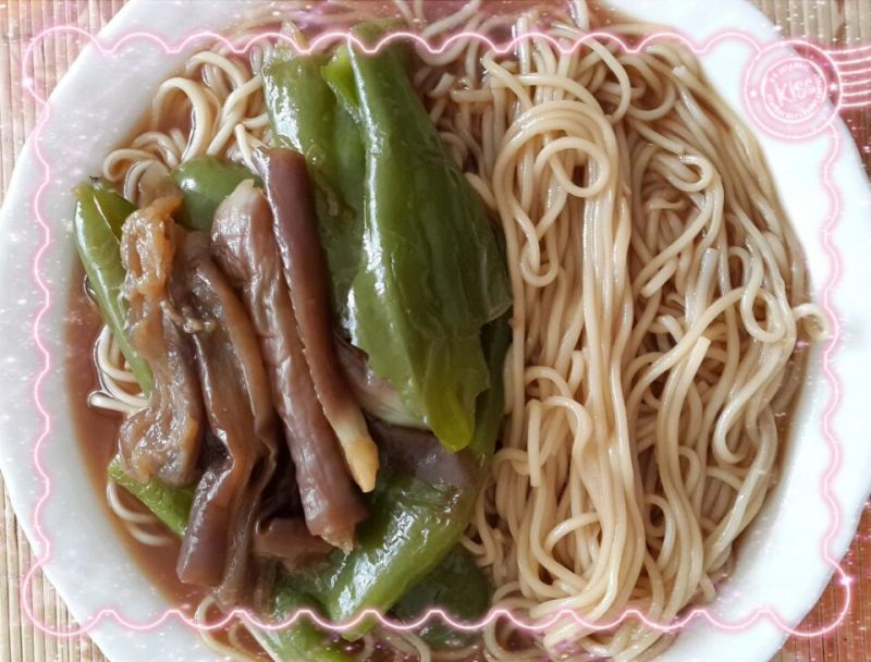 5:尖椒茄子内放入水、生抽、盐,煮透,关火,放入沥干的面条并拌匀。