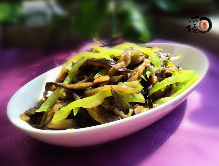 1、先把青椒丝炒至断生即可,防止时间长失去青翠的口感2、茄子离不开蒜,所以要用蒜片爆香