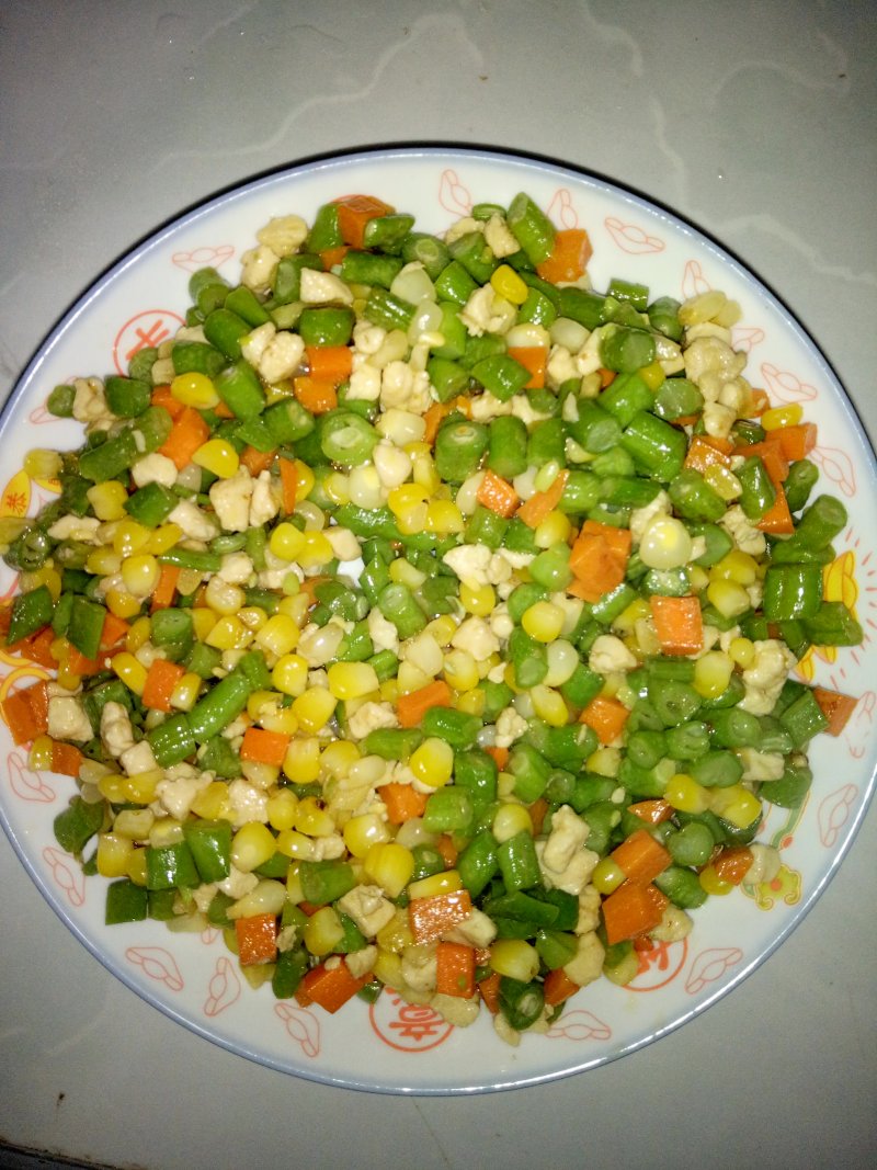 1:.材料:北豆腐300克胡萝卜1截玉米150克豌豆100克生姜1小块大蒜1瓣调料:调和油适量盐巴适量味精适量白糖少许