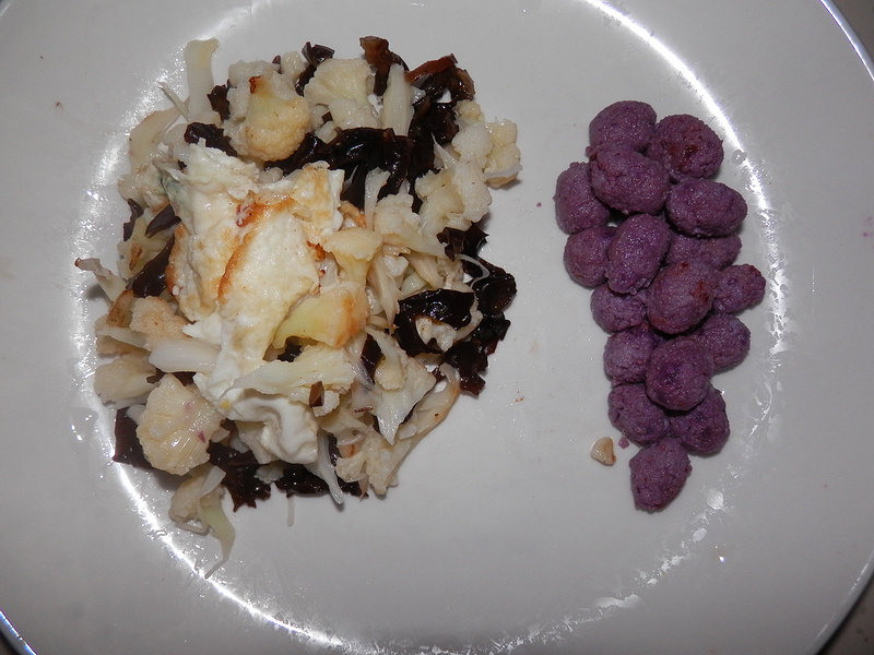 7:把紫薯团成球在盘的一边摆成葡萄状,另一边装炒双拼。