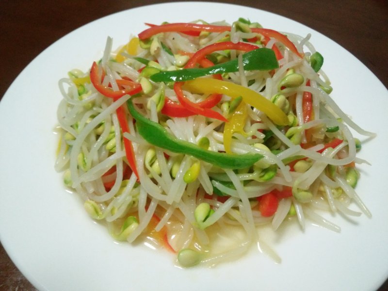 黄豆芽300g;黄彩椒半个;青椒半个;红辣椒半个;