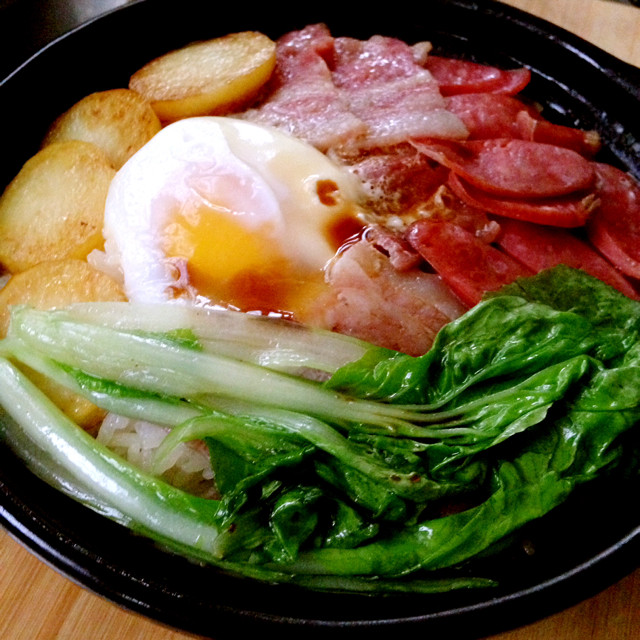 泰国香米1汤匙;土豆1个;鸡蛋1个;台式腊肠3个;小白菜1棵;培根1条;