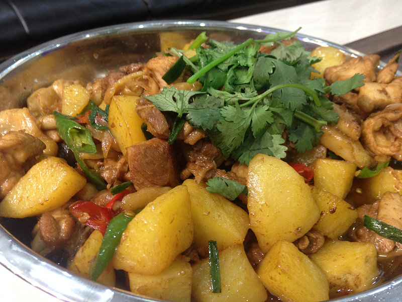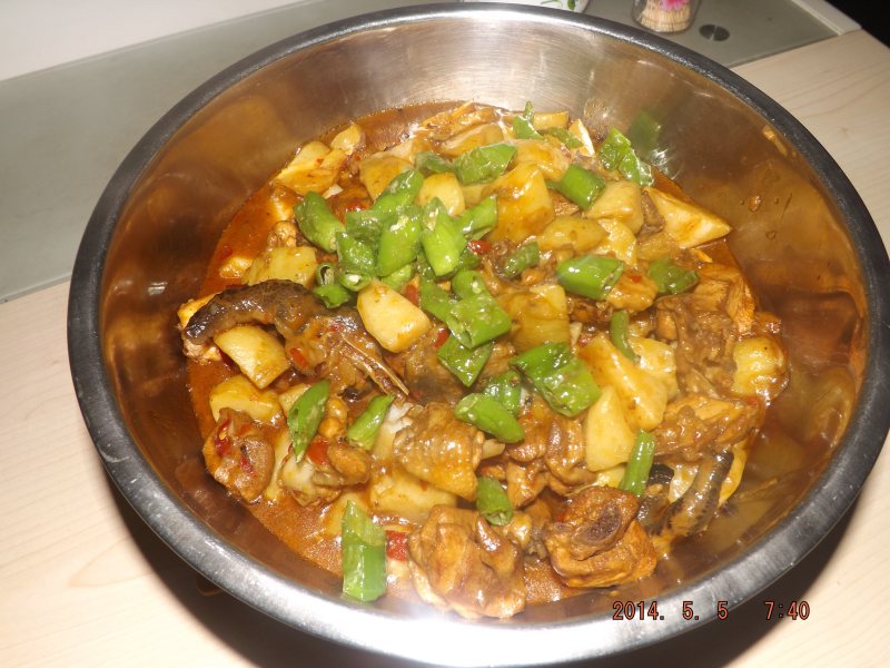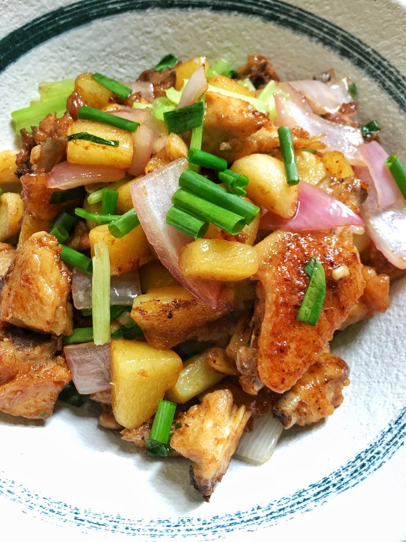 3:锅中倒油,放入姜片,蒜,指天椒,葱白爆香,倒入腌好的鸡肉,翻炒至变色,加入土豆翻炒会