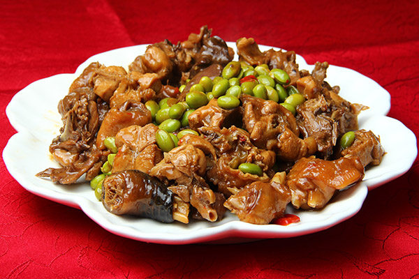 4:锅入少许油,煸炒鸡块,倒入毛豆、红椒,调入酱油、少许辣椒油、料酒,加入水,盖上锅盖焖烧15分钟~