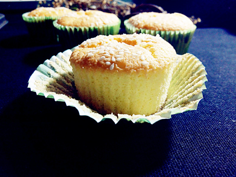 8:这6个蛋糕坯撒了点白芝麻,震出气泡。