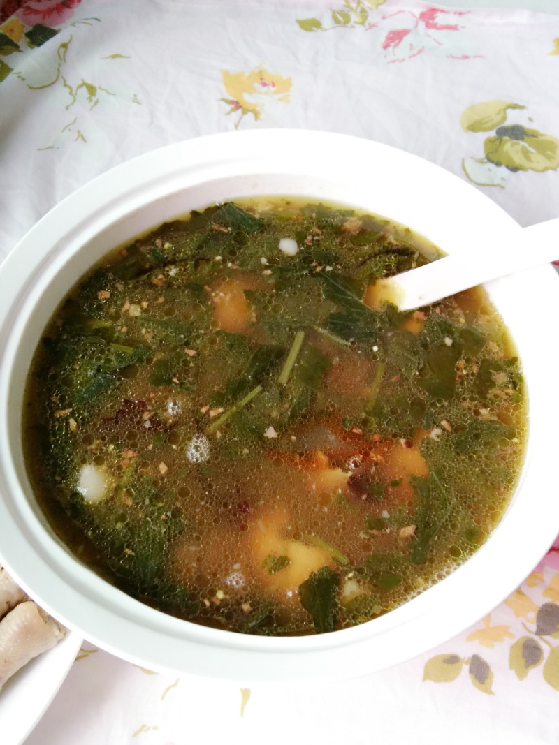 2:锅内倒入高汤烧开,放入海参煮15分钟,再放入益母草煮3分钟,捞起,放入碗里。