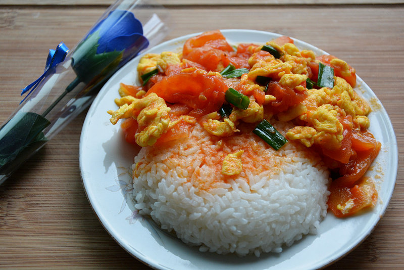 8:出锅,配上一小碗米饭,番茄炒蛋盖浇饭ok。